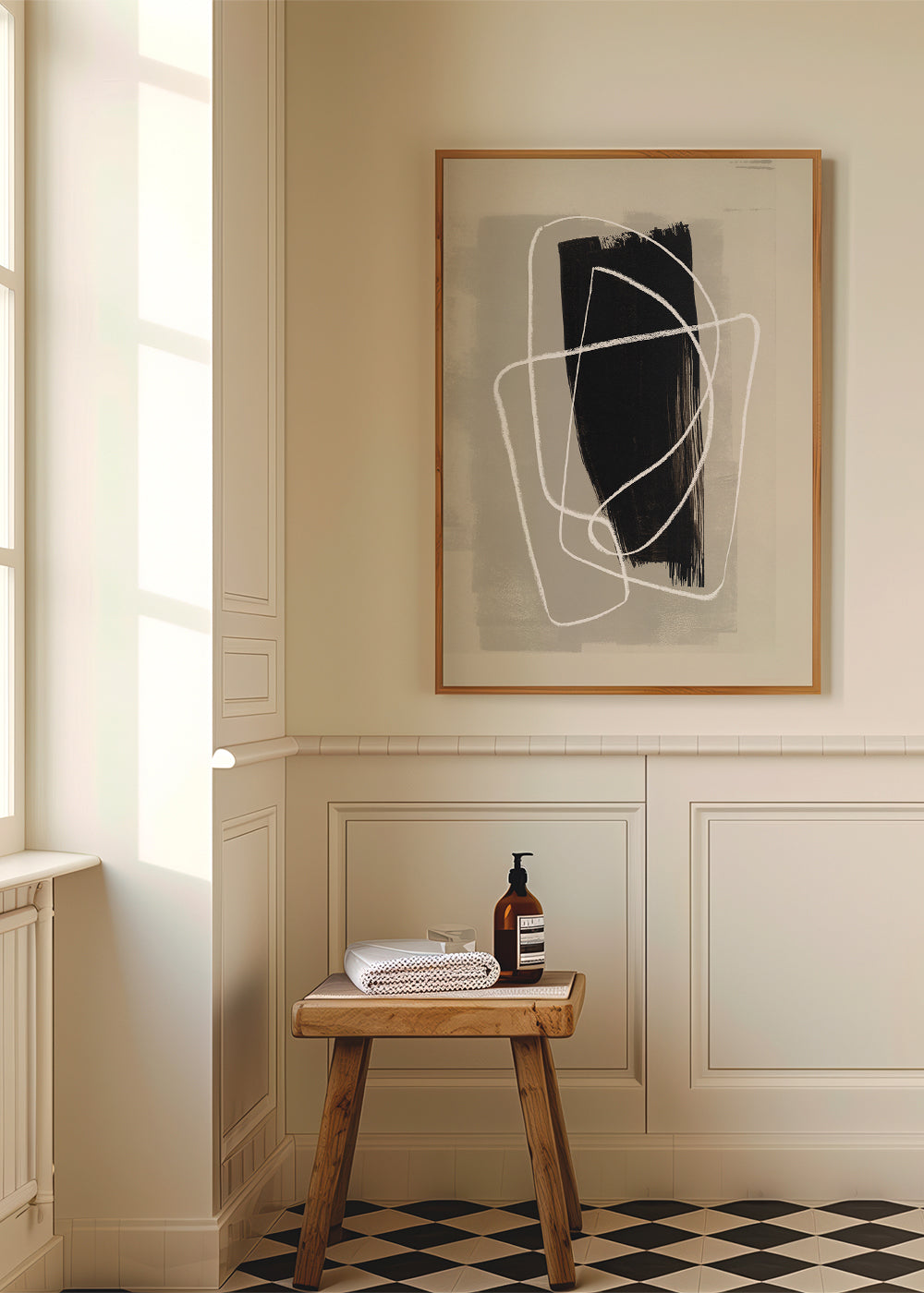 Wenn Sie die Passepartout-Option wählen, fügen wir die weiße matte Platte dem Rahmen hinzu und reduzieren das Design der Arbeit. Wählen Sie beispielsweise ein Druckformat 50x70 cm, mit eichenfarbenem Rahmen und Passepartout, reduzieren wir das Design des Druckes auf das bisherige Format (40x50cm). So passt es sich perfekt an das Innenfenster des Passepartouts an.