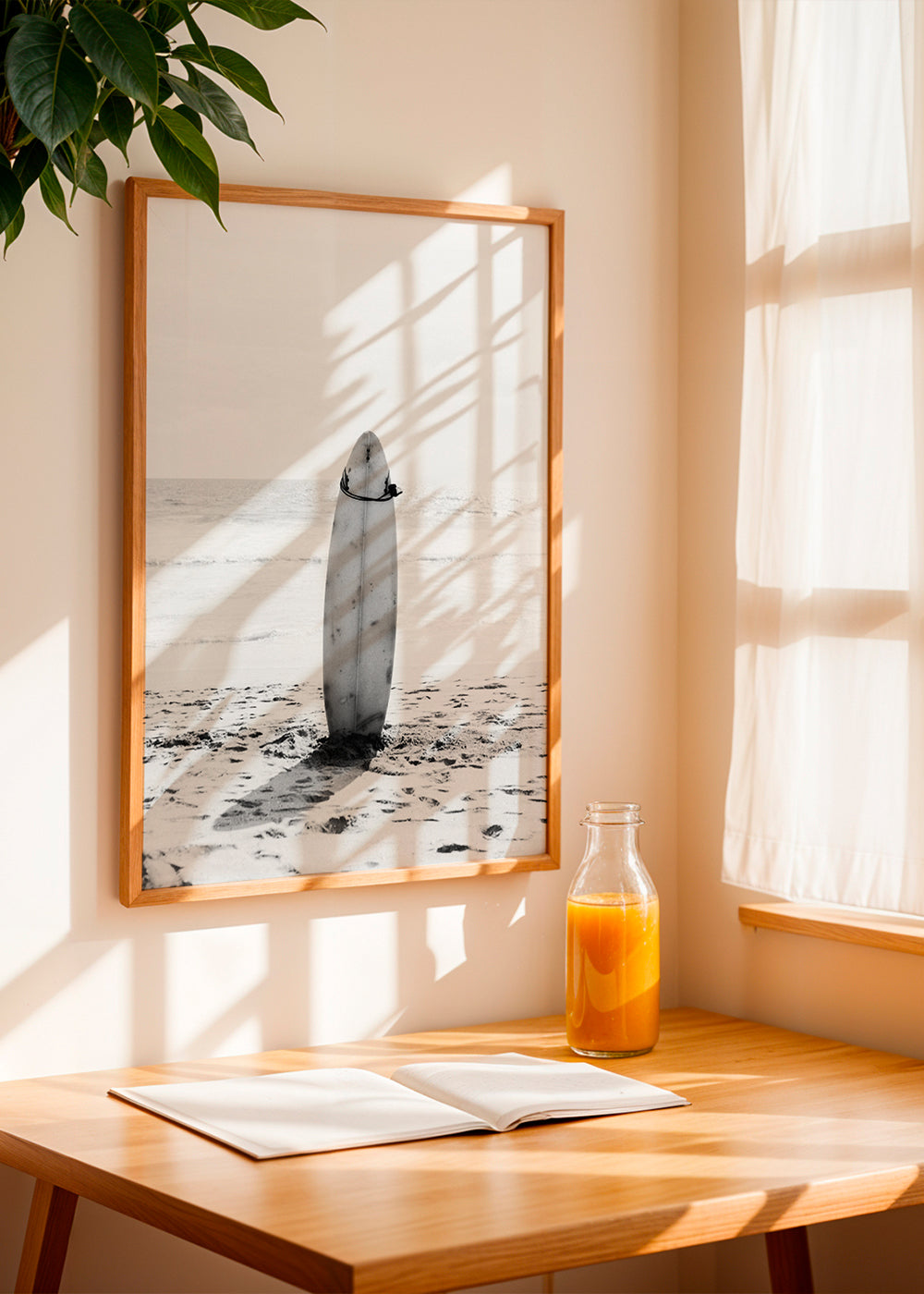 Poster in Schwarz-Weiß Beach Vintage Surfing board Black & White