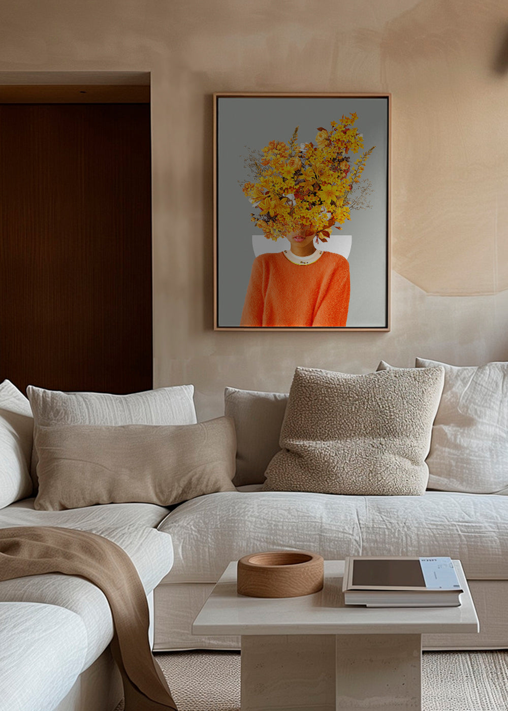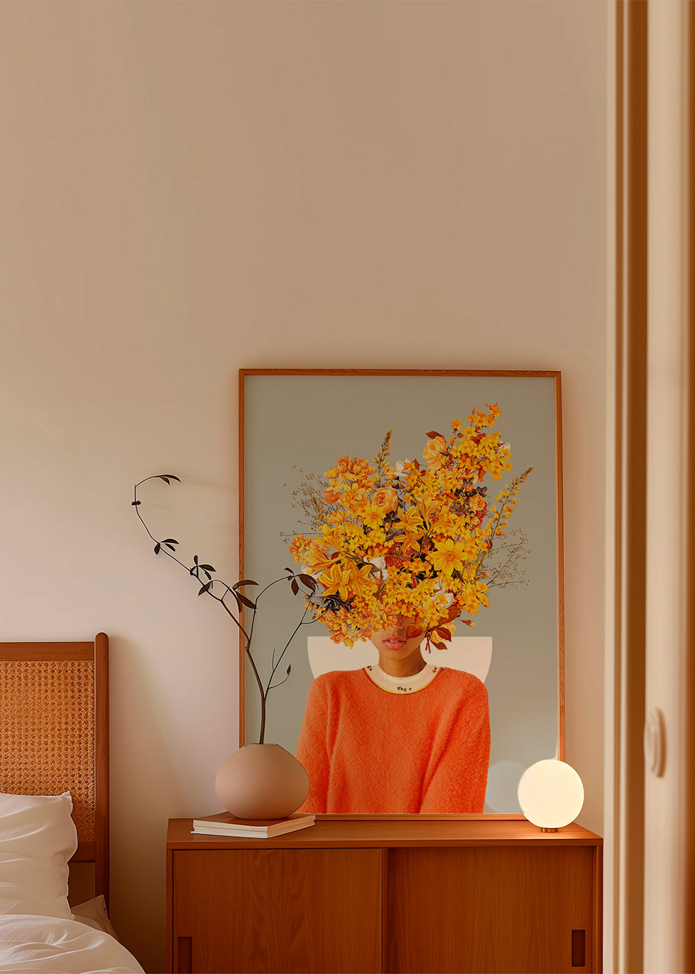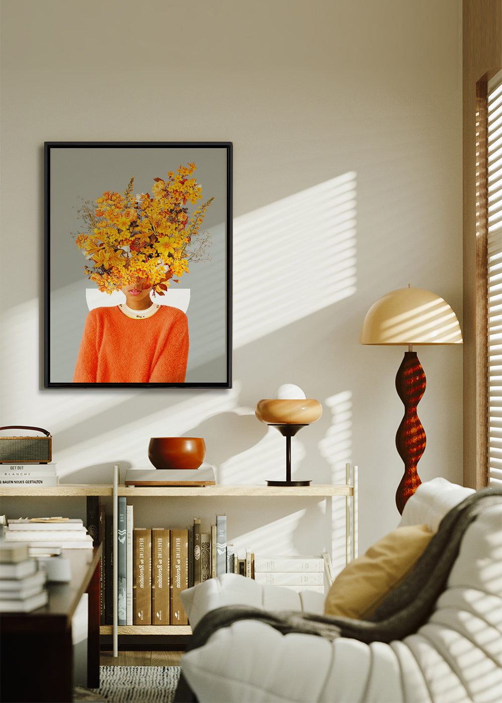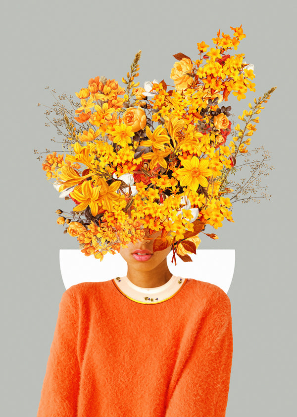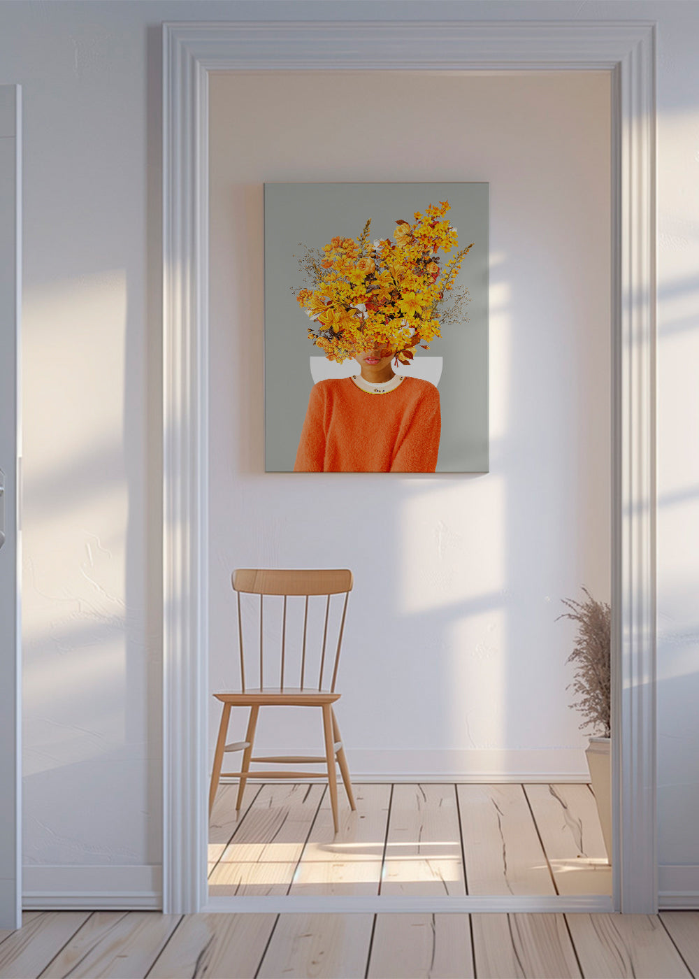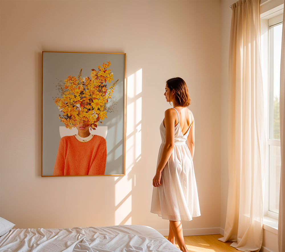 Ein Poster aus der Kollektion wandbild mit frau, designed von Frank Moth, mit Pigmenten gelb, und Bildorientierung vertikal. Stille, Ruhe, Frieden … Setzte bei deinem Wohnstil auf Achtsamkeit. Frische und Originalität.